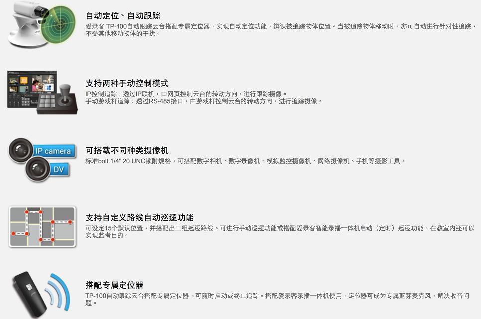| 爱录客 TP-100自动跟踪云台,可搭载不同种类的摄像机,进行水平与垂直转动;搭配轻巧无线定位器, 可针对各种室内场合进行主讲者(或焦点物体)的跟踪摄影。除了透过IE浏览器进行功能设定,爱录客自动跟踪云台亦提供自动跟踪与两种手动跟踪控制模式,大大提高使用者的便利性, 成为实现追踪录像的最佳选择工具。 |