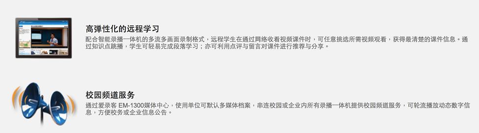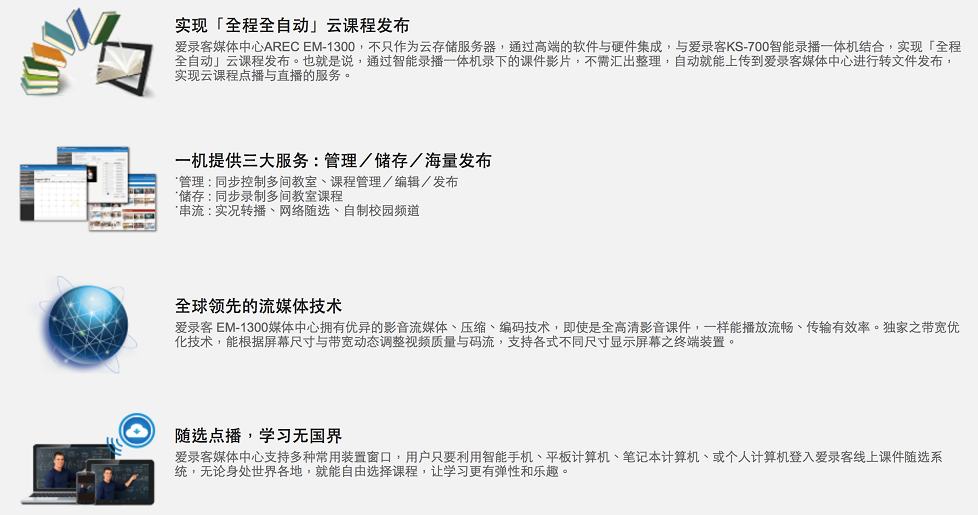 | 爱录客媒体中心AREC EM-1300拥有强大的系统运算能力,搭配独家带宽优化处理技术,提供用户播放流畅、系统稳定的服务。此外,EM-1300媒体中心提供多种软件模块,不但让管理单位轻松就能打造专属的影像发布中心,完善的管理功能让操作与使用更有成效。 |
