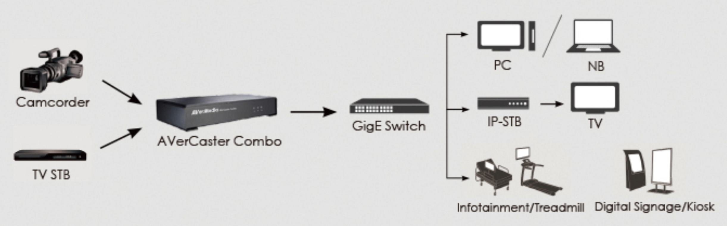 | Featuring multicast over IP network, AVerCaster Combo can distribute high-definition digital TV, analog TV and various video contents to an unlimited number of users on the LAN simultaneously. And AVerCaster Combo can support various kinds of client devices, such as computer, IP-STB, kiosk, digital signage and hospital infotainment devices. In addition, this product is equipped with intuitive web-based content control interface, high video transmission quality and AVerMedia’s quality technical support, which realizes a seamless and cost-effective solution for maximum audience reach. Comparing to the traditional coaxial cable or aerial based TV/video distribution systems, it provides the most cost-effective solution for small and medium-sized enterprises. |