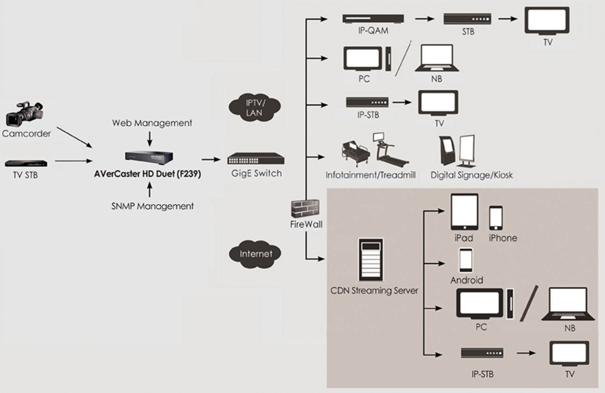 This single box streams HD contents via standard protocols. Thus, the live video information or entertainment broadcasts can be delivered to a wide range of client devices including computers, IP-STB, kiosk, digital signage and hospital infotainment terminals. It can be easily deployed into existing network environment and common system without extra cost and effort. Besides, AVerCaster HD Duet adopts H.264 compression, which can get rid of the dilemma of high video quality and efficient bandwidth usage.
