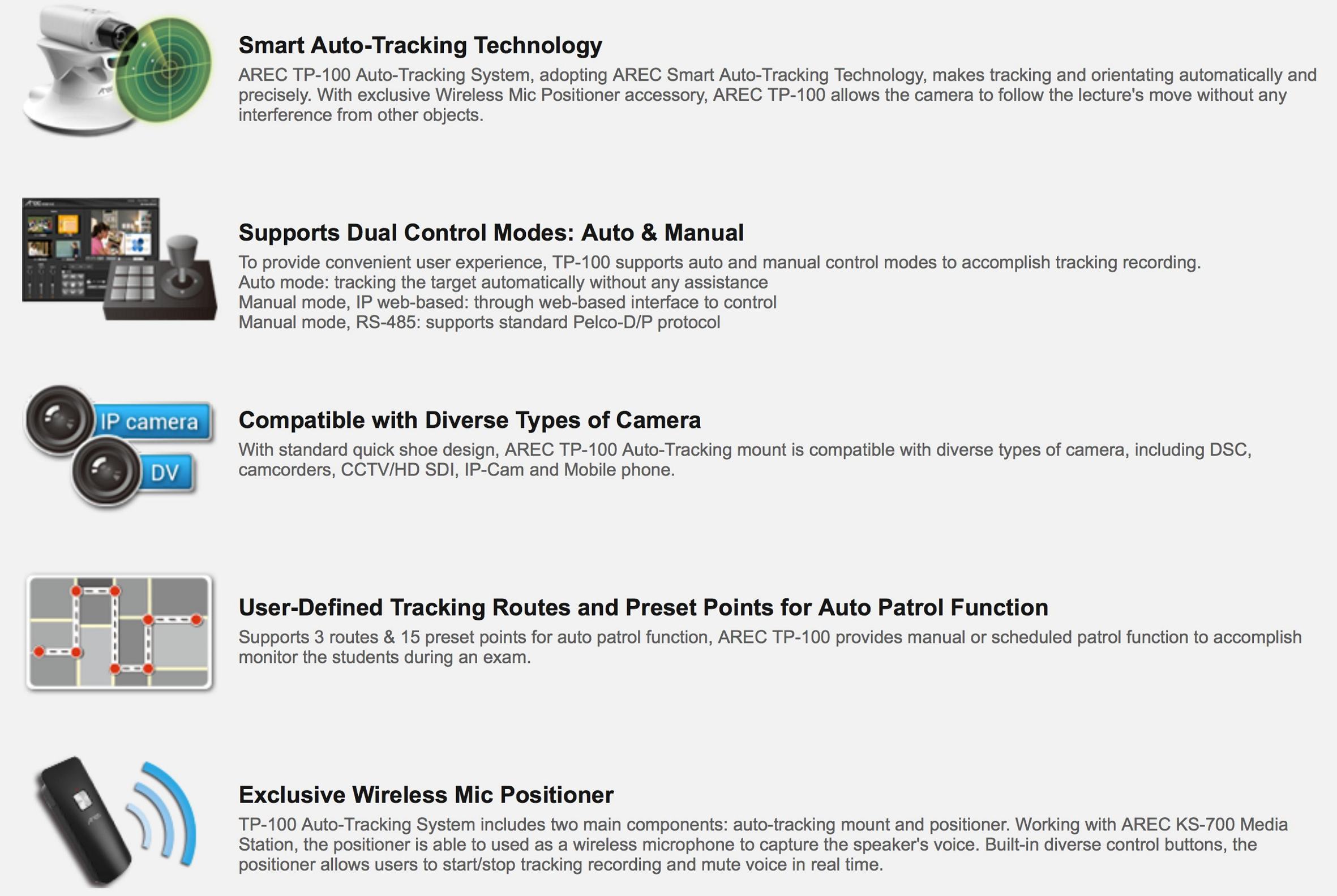 | In order to capture lecturer's best performance, AREC TP-100 Auto-Tracking System can track the specific target precisely with exclusive Wireless Mic Positioner. Compatible with diverse types of camera, AREC TP-100 Mount enables pan/ tilt tracking by auto or manual control. |