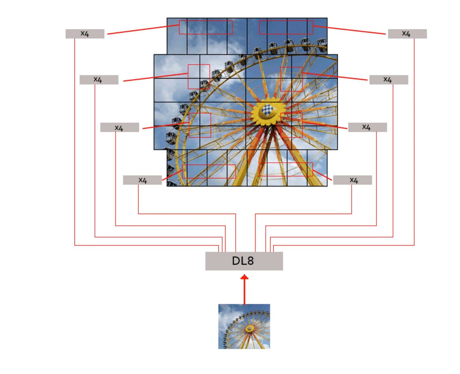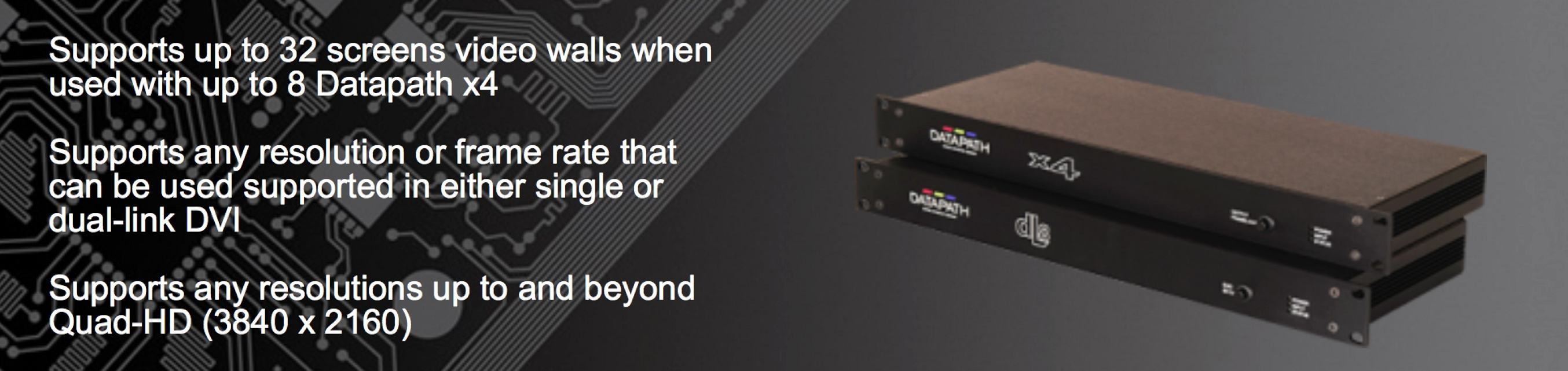 The Datapath dL8 has been design and developed to operate with the x4 stand alone display wall controller. This is a perfect partnership of a dL8 and up to eight Datapath x4 stand alone display wall controllers, allows the user to utilise their creative imagination to construct display solutions for digital signage applications and video walls. Each of the x4 units can accept one of dual-link DVI output from the dL8 and select four arbitrary regions from it for display all standard DVI (single-link)/ HDMI monitors. Using this solution it is possible to create up to 32 screen video walls, with complex display wall arrangements for any mixture of landscape and portrait display formats. Since the dL8 guarantees that all eight outputs are exactly locked to the source, all these 32 screens can be frame-locked for optimum display of creative, dynamic content. |